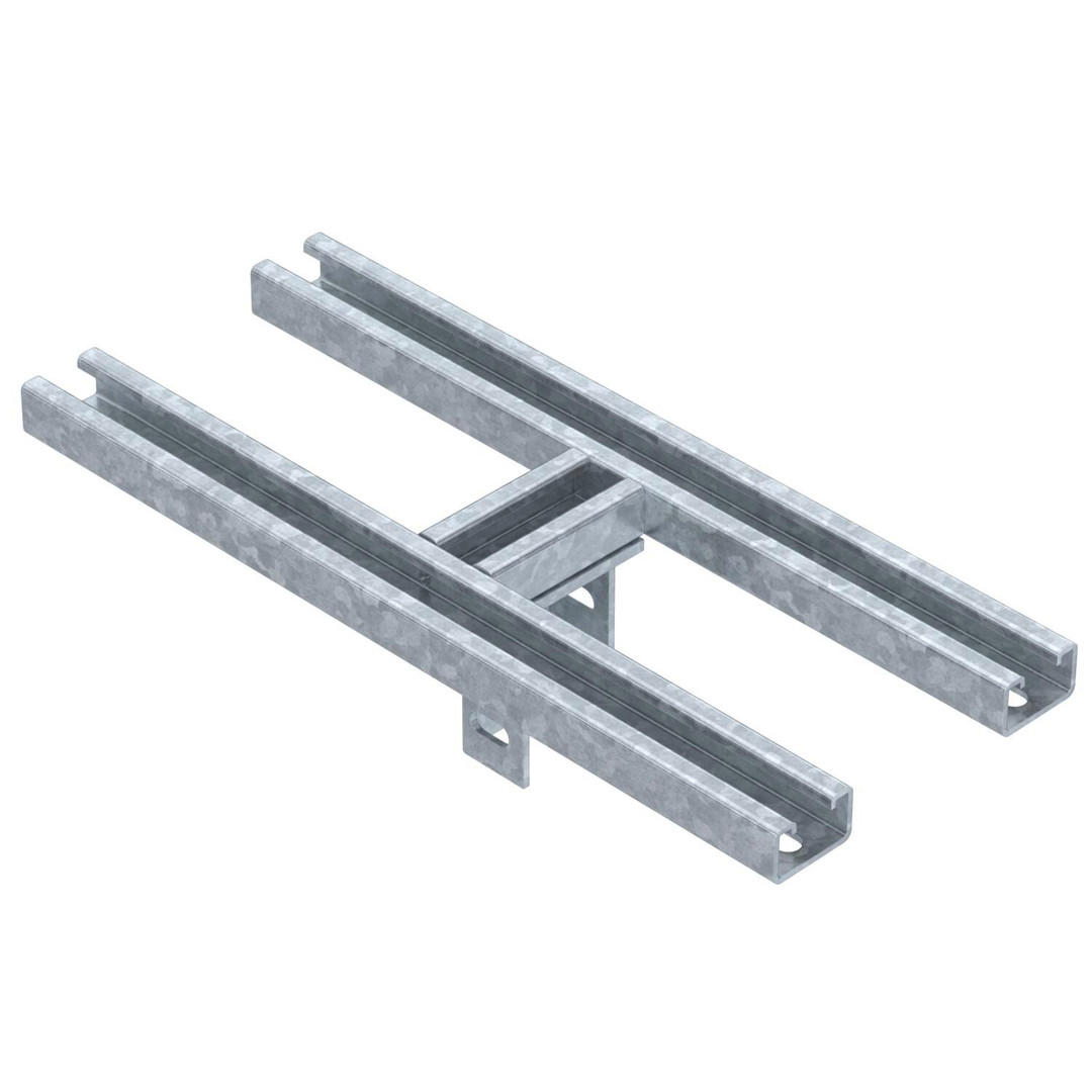 Kopfplatte in schwerer Ausführung mit zwei angeschweißten MS5030-Profilschienen, zum Erstellen von Hängestielen in Verbindung mit US 7-Stielen. Montage an Stahlkonstruktionen mit Spannklauen. Kabeltrassenverlauf parallel zu den Profilschienen. Inklusive Befestigungsmaterial für US 7-Stiel.