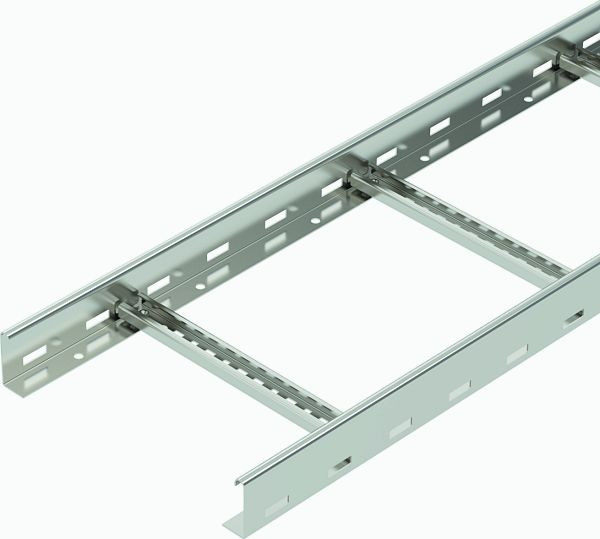 Kabelleiter in Seitenhöhe 60 mm mit eingeschweißten, nach oben offenen C30- Profil Sprossen. Eingerollter Seitenholm zur Verstärkung und als Kantenschutz. Die Befestigung auf dem Ausleger erfolgt mit Klemmstücken Typ LKS 40. Das Schlitzmaß der Sprosse beträgt 16,5 mm, die passende Bügelschelle ist der Typ 2056.