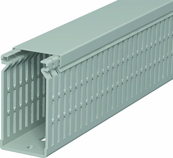 Verdrahtungskanal inkl. Oberteil und Bodenlochung zur waagerechten und senkrechten Verlegung elektrischer Kabel und Leitungen im Schaltschrank. Ausführung als metrischer Kanal. Das Nennmaß der Systemgröße entspricht dem Innenmaß der Kanäle. Das Ausbrechen der Stege erfolgt werkzeuglos. Bodenbündiges Ausführen ist durch Sollbruchstellen möglich. Verjüngungen in den Seitenschlitzen verhindern das Herausfallen der Leitungen. Geprüft nach DIN EN 50085-2-3. Sonderlängen auf Anfrage.