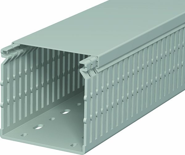 Verdrahtungskanal inkl. Oberteil und Bodenlochung zur waagerechten und senkrechten Verlegung elektrischer Kabel und Leitungen im Schaltschrank. Ausführung als metrischer Kanal. Das Nennmaß der Systemgröße entspricht dem Innenmaß der Kanäle. Das Ausbrechen der Stege erfolgt werkzeuglos. Bodenbündiges Ausführen ist durch Sollbruchstellen möglich. Verjüngungen in den Seitenschlitzen verhindern das Herausfallen der Leitungen. Geprüft nach DIN EN 50085-2-3. Sonderlängen auf Anfrage.