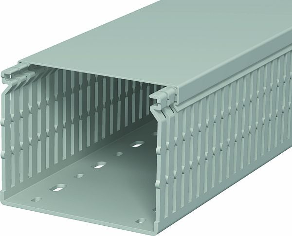 Verdrahtungskanal inkl. Oberteil und Bodenlochung zur waagerechten und senkrechten Verlegung elektrischer Kabel und Leitungen im Schaltschrank. Ausführung als metrischer Kanal. Das Nennmaß der Systemgröße entspricht dem Innenmaß der Kanäle. Das Ausbrechen der Stege erfolgt werkzeuglos. Bodenbündiges Ausführen ist durch Sollbruchstellen möglich. Verjüngungen in den Seitenschlitzen verhindern das Herausfallen der Leitungen. Geprüft nach DIN EN 50085-2-3. Sonderlängen auf Anfrage.