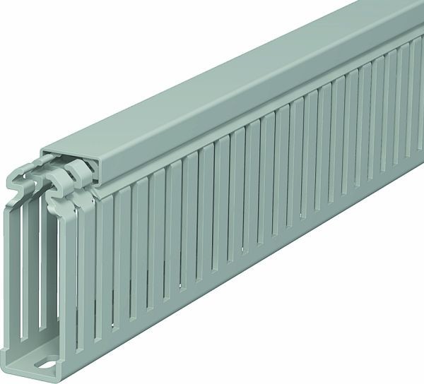 Verdrahtungskanal nach DIN EN 50085-2-3 inkl. Oberteil und Bodenlochung zur waagerechten und senkrechten Verlegung elektrischer Kabel und Leitungen im Schaltschrank. Ausführung als DIN-Kanal. Das Ausbrechen der Stege erfolgt werkzeuglos. Bodenbündiges Ausführen ist durch Sollbruchstellen möglich. Geprüft nach DIN EN 50085-2-3. Sonderlängen auf Anfrage.