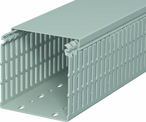 Verdrahtungskanal nach DIN EN 50085-2-3 inkl. Oberteil und Bodenlochung zur waagerechten und senkrechten Verlegung elektrischer Kabel und Leitungen im Schaltschrank. Ausführung als DIN-Kanal. Das Ausbrechen der Stege erfolgt werkzeuglos. Bodenbündiges Ausführen ist durch Sollbruchstellen möglich. Verjüngungen in den Seitenschlitzen verhindern das Herausfallen der Leitungen. Geprüft nach DIN EN 50085-2-3. Sonderlängen auf Anfrage.