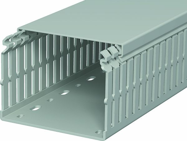 Verdrahtungskanal nach DIN EN 50085-2-3 inkl. Oberteil und Bodenlochung zur waagerechten und senkrechten Verlegung elektrischer Kabel und Leitungen im Schaltschrank. Ausführung als DIN-Kanal. Das Ausbrechen der Stege erfolgt werkzeuglos. Bodenbündiges Ausführen ist durch Sollbruchstellen möglich. Verjüngungen in den Seitenschlitzen verhindern das Herausfallen der Leitungen. Geprüft nach DIN EN 50085-2-3. Sonderlängen auf Anfrage.