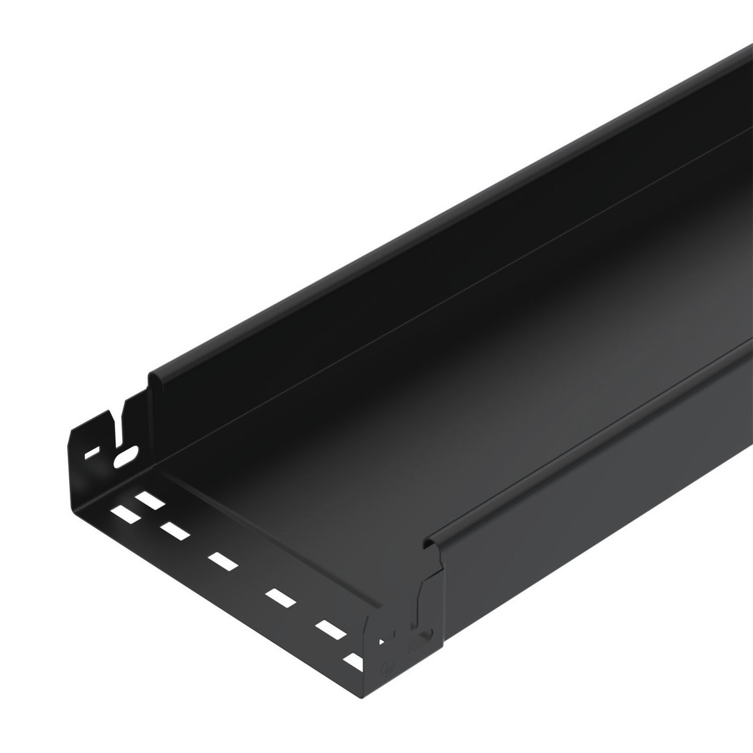 Ungelochte Kabelrinne mit integriertem Schnellbefestigungssystem. Schwarz beschichtet.