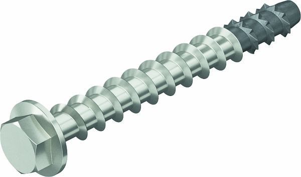 Edelstahl-Schraubanker zur direkten Montage ohne Dübel in gerissenem und ungerissenem Beton sowie Mauerwerk. Mit Sechskantantrieb und angepresster Scheibe zur Aufnahme großer Lasten. Geeignet für die Befestigung von Hängestielen und Wandauslegern in Feuchträumen und im Außenbereich.