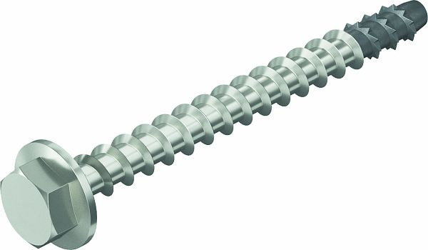 Edelstahl-Schraubanker zur direkten Montage ohne Dübel in gerissenem und ungerissenem Beton sowie Mauerwerk. Mit Sechskantantrieb und angepresster Scheibe zur Aufnahme großer Lasten. Geeignet für die Befestigung von Hängestielen und Wandauslegern in Feuchträumen und im Außenbereich.
