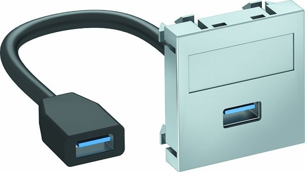 Multimediaträger mit einer USB 3.0-Anschlussbuchse, Kabelauslass gerade, mit Beschriftungsfeld, kurzes USB 3.0 Typ A-Anschlusskabel in Ausführung Buchse-Buchse. Trägerplatte mit Rastbefestigung, geeignet für den waagerechten und senkrechten Einbau in die Systemumgebung.