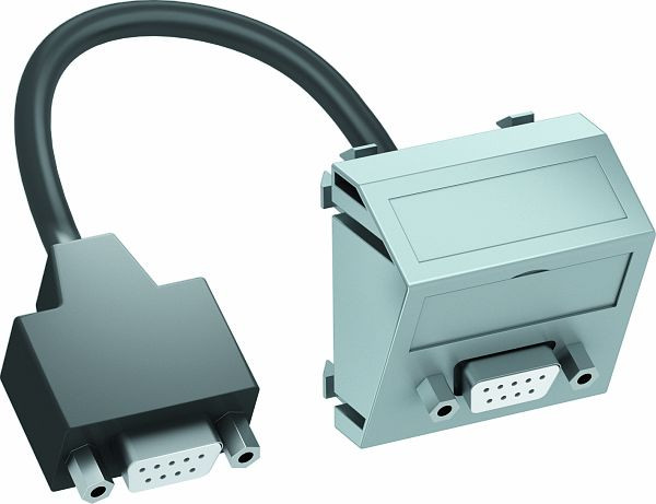 Multimediaträger mit einer D-Sub9-Anschlussbuchse, Kabelauslass schräg, mit Beschriftungsfeld, kurzes D-Sub9-Anschlusskabel (RS232) in Ausführung Buchse-Buchse. Träger mit Rastbefestigung, geeignet für den waagerechten und senkrechten Einbau in die Systemumgebung.