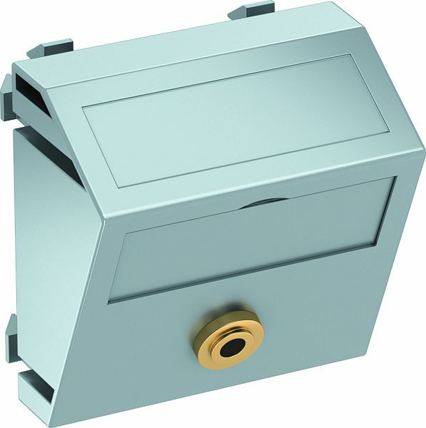 Multimediaträger mit einer Mini-Klinken-Anschlussbuchse, Kabelauslass schräg, mit Beschriftungsfeld, Mini-Klinken-Buchse (TRS 3,5 mm) mit Lötanschluss. Trägerplatte mit Rastbefestigung, geeignet für den waagerechten und senkrechten Einbau in die Systemumgebung.