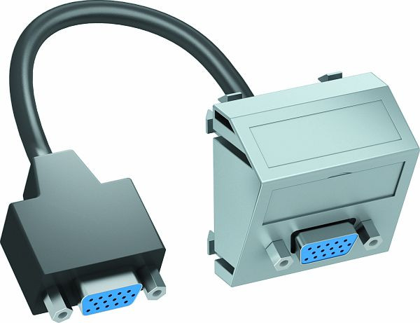 Multimediaträger mit einer VGA-Anschlussbuchse, Kabelauslass schräg, mit Beschriftungsfeld, kurzes VGA-Anschlusskabel (HD15) in Ausführung Buchse-Buchse. Träger mit Rastbefestigung, geeignet für den waagerechten und senkrechten Einbau in die Systemumgebung.