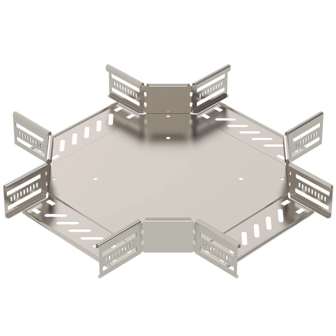 Kreuzung zum Erstellen einer horizontalen Abzweigung, Formteil für rast- und schraubbare Kabelrinnen Seitenhöhe 60 mm. Schraubenlose Montage mit Doppelklemmen oder Schraubverbindung mit Flachrundschrauben FRS und Kombimutter M6. Einsetzbar im Innen- und Außenbereich. Befestigungsmaterial muss separat bestellt werden.