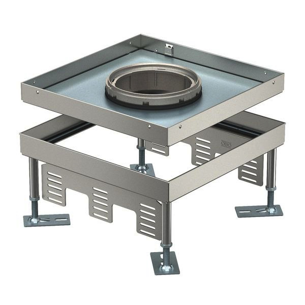 Nivellierbare quadratische Kassette für Tubus der Nenngröße 9 für den Einbau von Installationsgeräten in Kanalsystemen, Doppel- und Hohlböden in trocken oder nass gepflegten Fußböden im Innenbereich. Nur passend für glatte Bodenbeläge.
