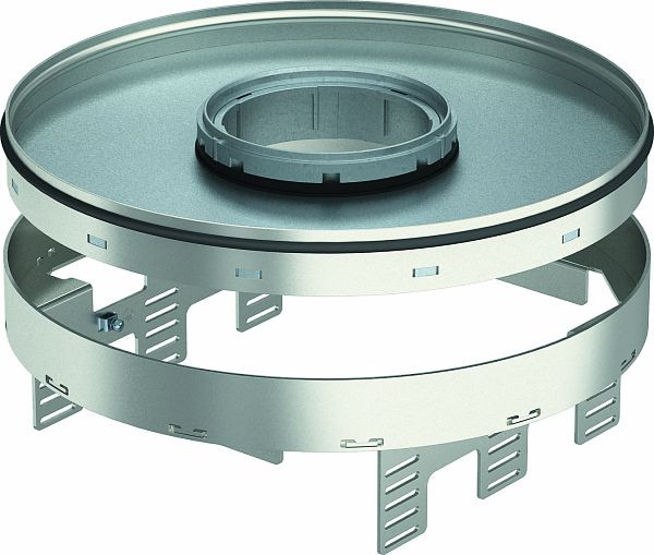 Nivellierbare und vom Fußboden entkoppelte Kassette der Nenngröße R9 für Tubus für den Einbau von Installationsgeräten in trocken oder nass gepflegten Fußböden im Innenbereich, zur Montage in Unterflurdosen UZD350-3 in Verbindung mit einem Montagedeckel DUG350-3R9 oder in UGD350-3R9. Die Montage erfolgt mittels Nivellierwinkeln (separat bestellen) im Aluminium-Rahmenprofil der Unterflurdosen.