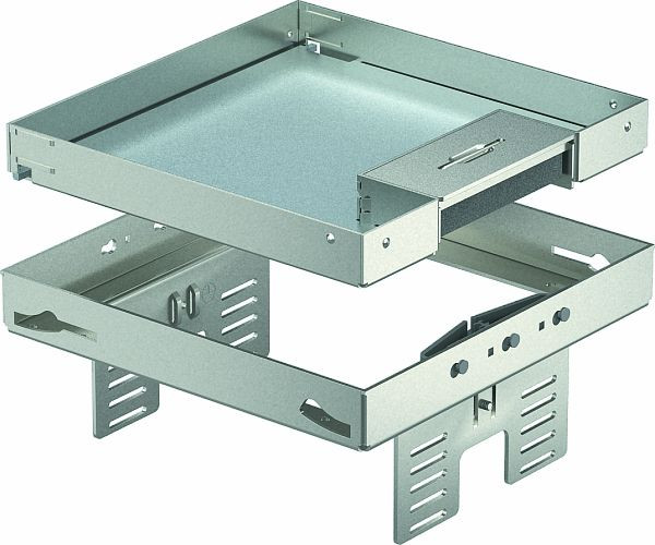 Nivellierbare und vom Fußboden entkoppelte Kassette der Nenngröße 4, mit Schnurauslass, für den Einbau von Installationsgeräten in trocken gepflegten Fußböden im Innenbereich, zur Montage in Unterflurdosen UZD250 oder UZD350, jeweils in Verbindung mit einem Montagedeckel DUG../4 oder in UGD250-3/4 oder UGD350-3/4. Die Montage erfolgt mittels Nivellierwinkel (separat bestellen) im Aluminium-Rahmenprofil der Unterflurdosen.
