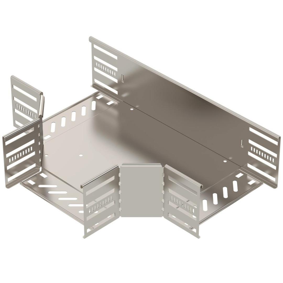 T-Stück zum Erstellen einer horizontalen Abzweigung, Formteil für rast- und schraubbare Kabelrinnen Seitenhöhe 110 mm. Schraubenlose Montage mit Doppelklemmen oder Schraubverbindung mit Flachrundschrauben FRS und Kombimuttern M6. Einsetzbar im Innen- und Außenbereich. Befestigungsmaterial muss separat bestellt werden.