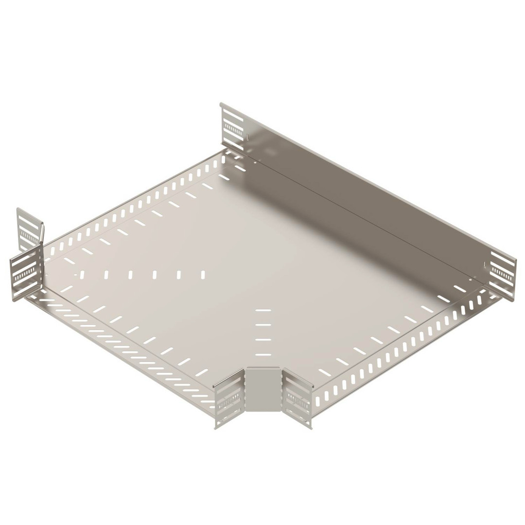 T-Stück zum Erstellen einer horizontalen Abzweigung, Formteil für rast- und schraubbare Kabelrinnen Seitenhöhe 110 mm. Schraubenlose Montage mit Doppelklemmen oder Schraubverbindung mit Flachrundschrauben FRS und Kombimuttern M6. Einsetzbar im Innen- und Außenbereich. Befestigungsmaterial muss separat bestellt werden.