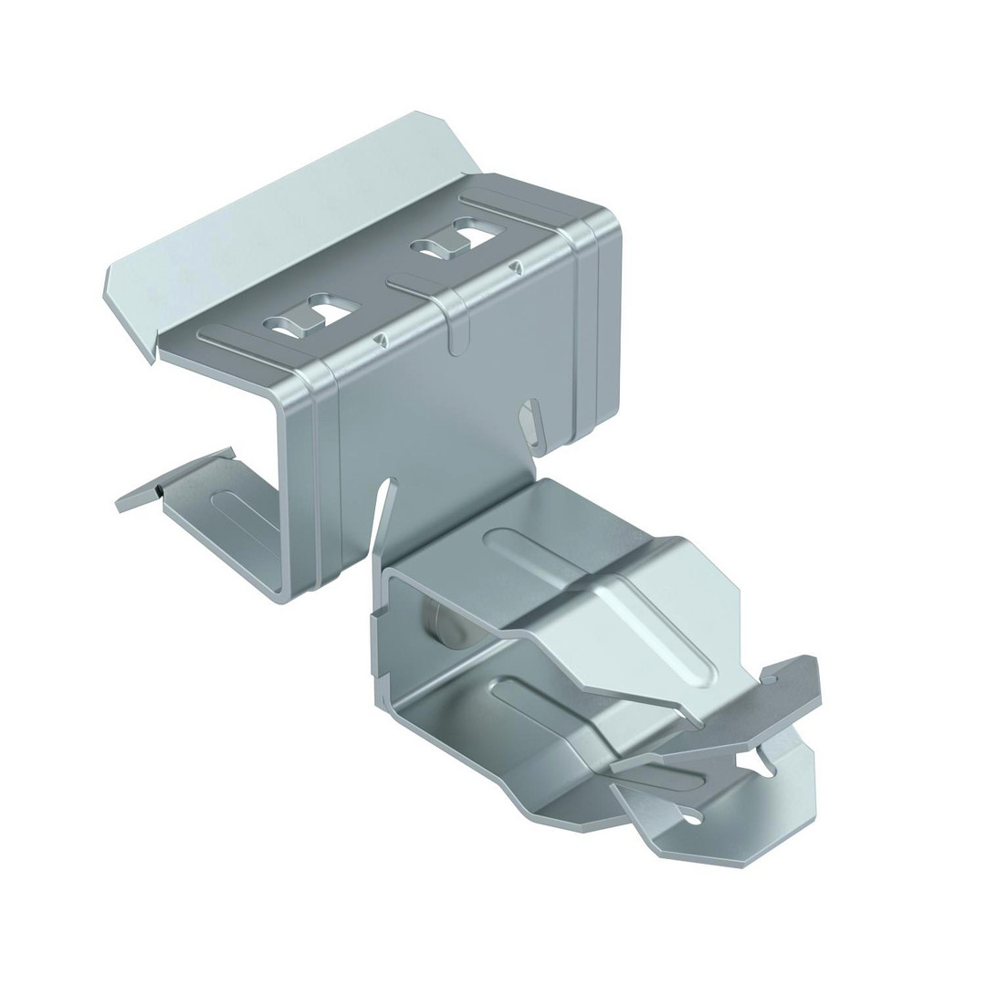Trägerklammer zum Montieren von Rohren. Offene Rohraufnahme seitlich. Befestigung an Stahträgern durch Aufschlagen.