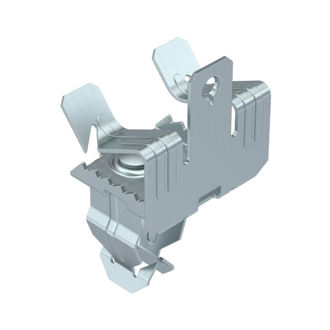 Trägerklammer zum Montieren von Rohren. Offene Rohraufnahme unten. Befestigung an Stahträgern durch Aufschlagen.