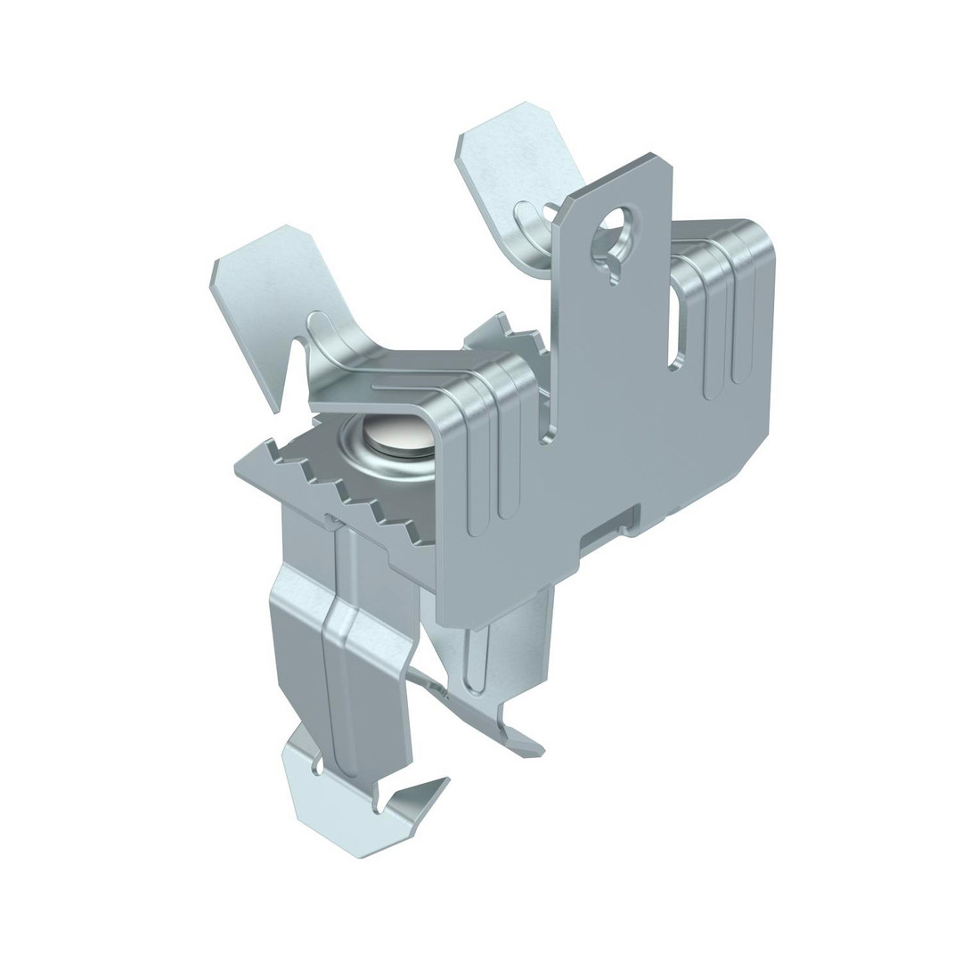 Trägerklammer zum Montieren von Rohren. Offene Rohraufnahme unten. Befestigung an Stahträgern durch Aufschlagen.