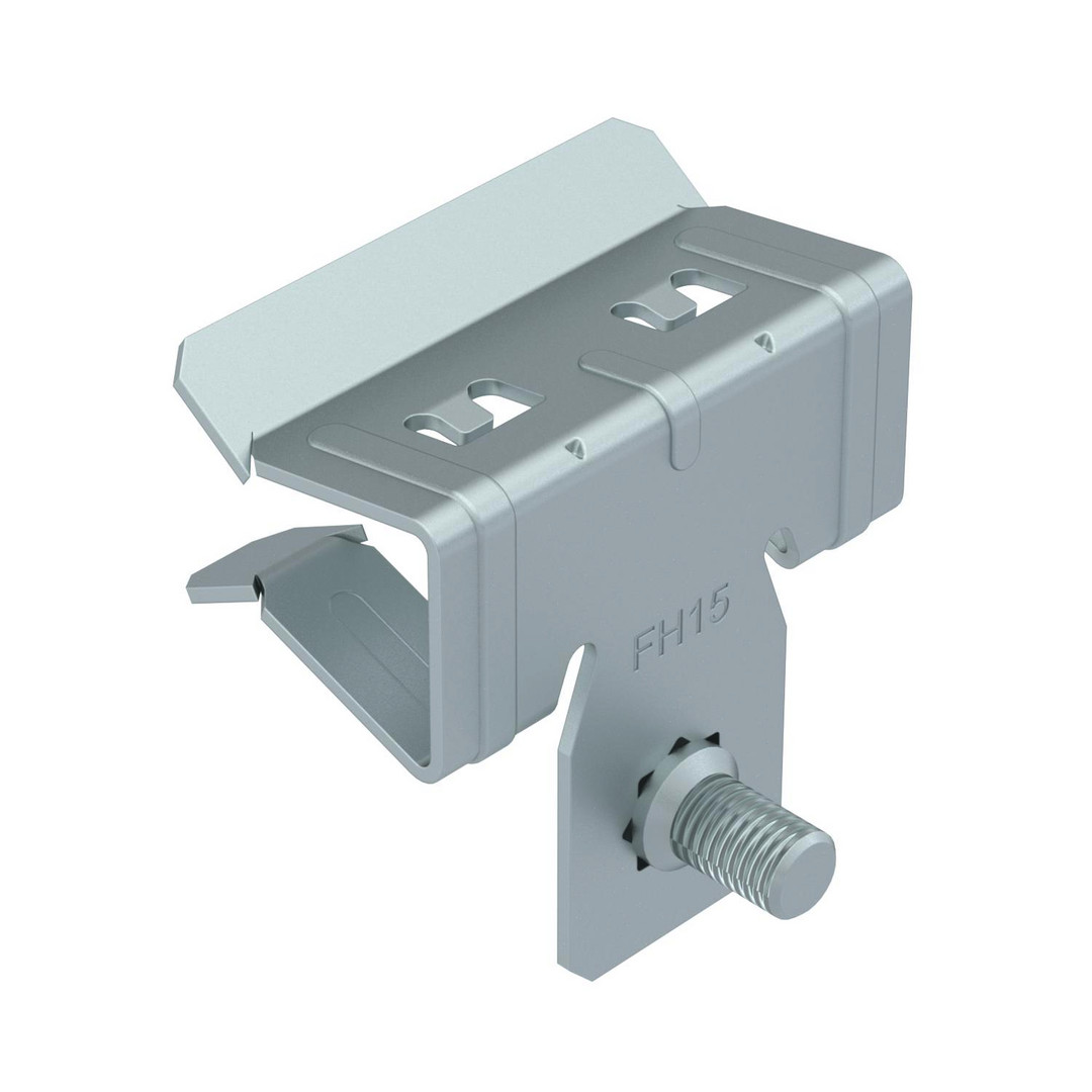 Trägerklammer mit Gewindebolzen M6 seitlich für individuelle Montagelösungen. Befestigung an Stahträgern durch Aufschlagen.