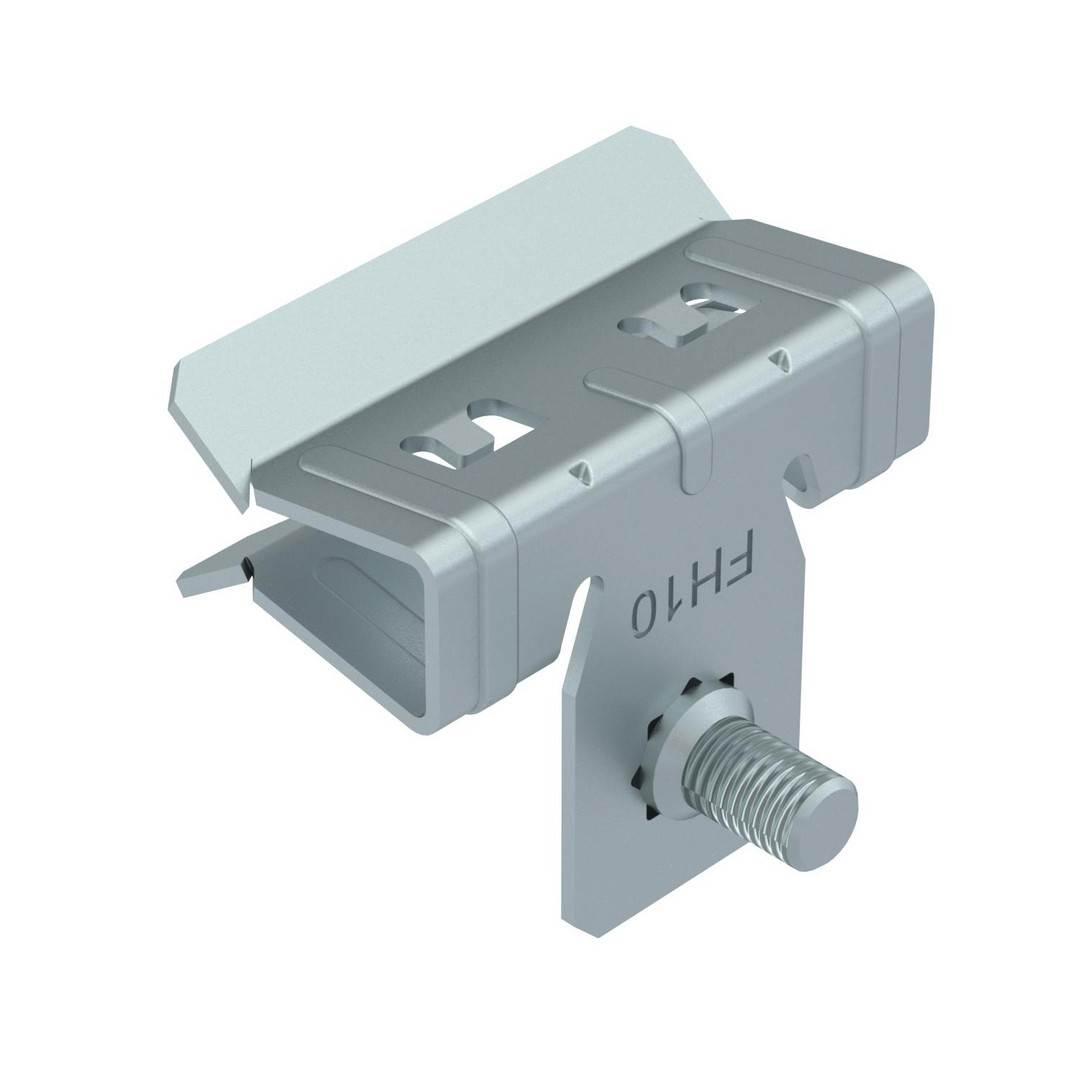 Trägerklammer mit Gewindebolzen M6 seitlich für individuelle Montagelösungen. Befestigung an Stahträgern durch Aufschlagen.