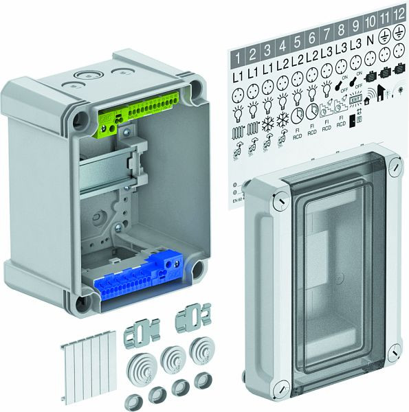 Kleinverteiler mit Klemmleiste zur Aufputz-Montage, für die Strom-Unterverteilung im Innen- und Außenbereich, gemäß IEC 439-3. Mit vormontierter 35-mm-Hutprofilschiene. Schutzart IP66 und Schutzgrad IK08. Transparenter Deckel zum Schrauben, mit Ausschnitt.