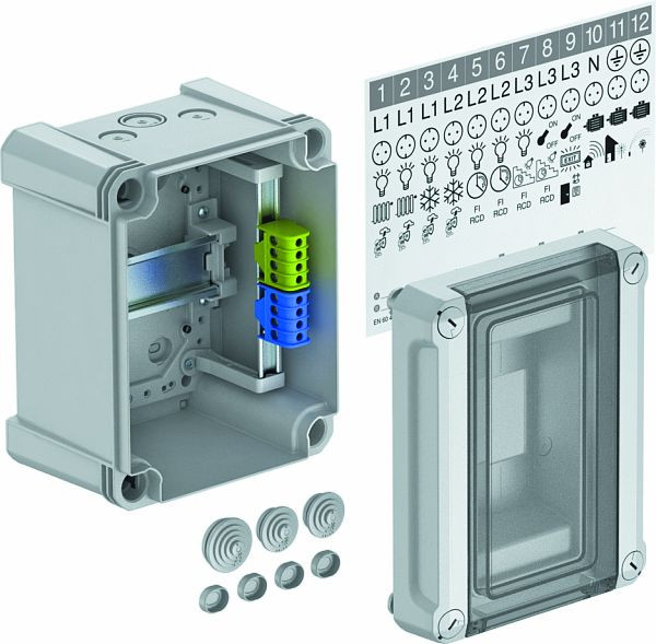 Kleinverteiler mit Klemmleiste zur Aufputz-Montage, für die Strom-Unterverteilung im Innen- und geschützten Außenbereich, gemäß IEC 439-3. Mit vormontierter 35-mm-Hutprofilschiene. Schutzart IP66 und Schutzgrad IK07. Transparenter Deckel zum Schrauben, mit Ausschnitt.