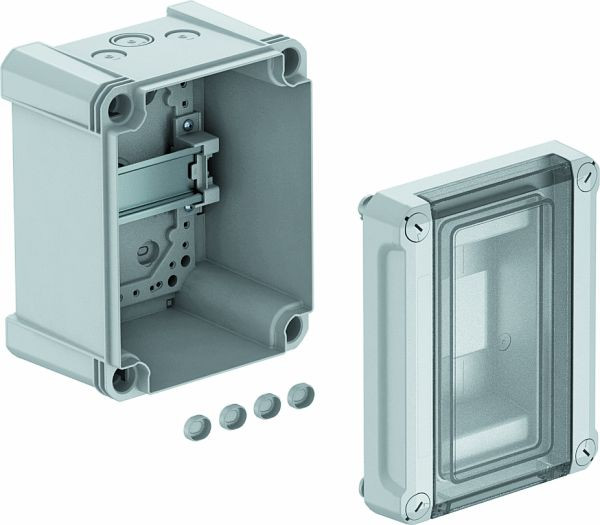 Kleinverteiler zur Aufputz-Montage, für die Strom-Unterverteilung im Innen- und geschützten Außenbereich, gemäß IEC 439-3. Mit vormontierter 35-mm-Hutprofilschiene. Schutzart IP66 und Schutzgrad IK07. Transparenter Deckel zum Schrauben, mit Ausschnitt.