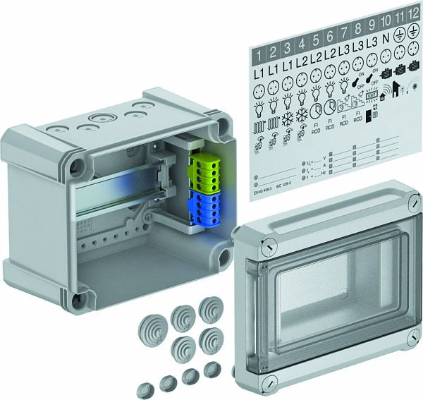 Kleinverteiler mit Klemmleiste zur Aufputz-Montage, für die Strom-Unterverteilung im Innen- und geschützten Außenbereich, gemäß IEC 439-3. Mit vormontierter 35-mm-Hutprofilschiene. Schutzart IP66 und Schutzgrad IK07. Transparenter Deckel zum Schrauben, mit Ausschnitt.