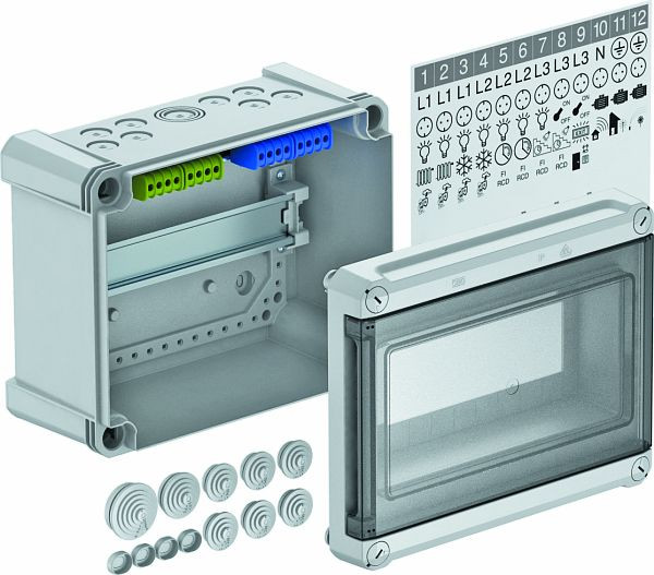 Kleinverteiler mit Klemmleiste zur Aufputz-Montage, für die Strom-Unterverteilung im Innen- und geschützten Außenbereich, gemäß IEC 439-3. Mit vormontierter 35-mm-Hutprofilschiene. Schutzart IP66 und Schutzgrad IK07. Transparenter Deckel zum Schrauben, mit Ausschnitt.