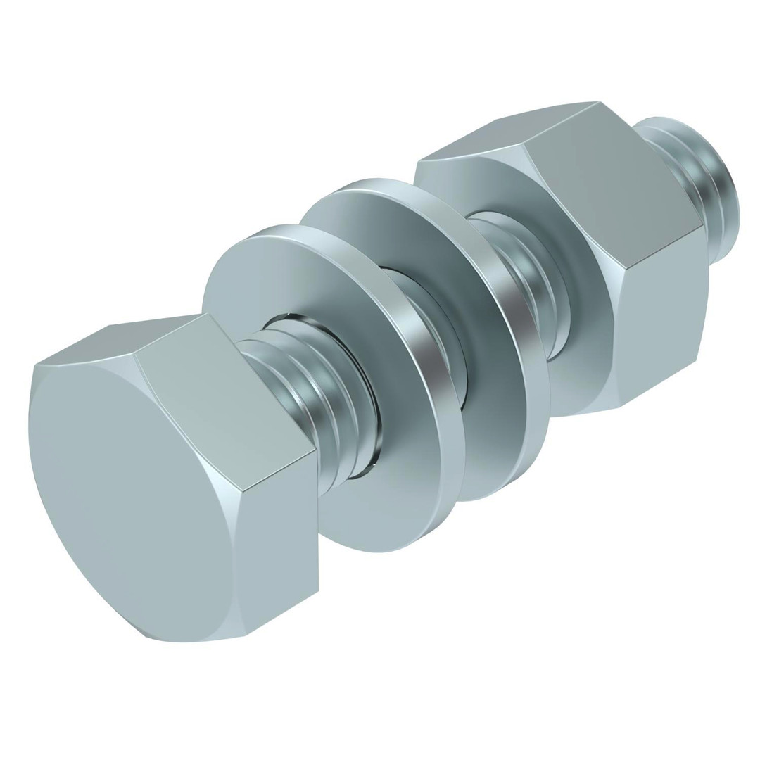 Sechskantschraube zur universellen Befestigung von Konstruktionsbauteilen. Inklusive Sechskantmutter und 2 Unterlegscheiben.