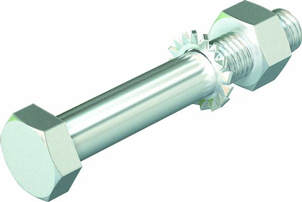 Sechskantschraube zur universellen Befestigung von Konstruktionsbauteilen. Inklusive Sechskantmutter und 2 Unterlegscheiben.