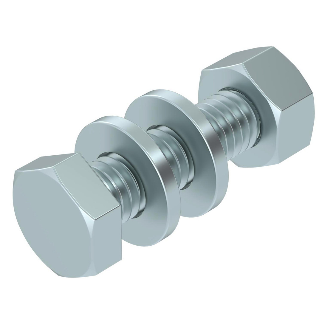 Sechskantschraube zur universellen Befestigung von Konstruktionsbauteilen. Inklusive Sechskantmutter und 2 Unterlegscheiben.