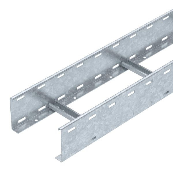 Kabelleiter in Seitenhöhe 110 mm mit eingeschweißten, nach oben offenen C30- Profil Sprossen. Eingerollter Seitenholm zur Verstärkung und als Kantenschutz. Die Befestigung auf dem Ausleger erfolgt mit Klemmstücken Typ LKS 40. Das Schlitzmaß der Sprosse beträgt 16,5 mm, die passende Bügelschelle ist der Typ 2056.
