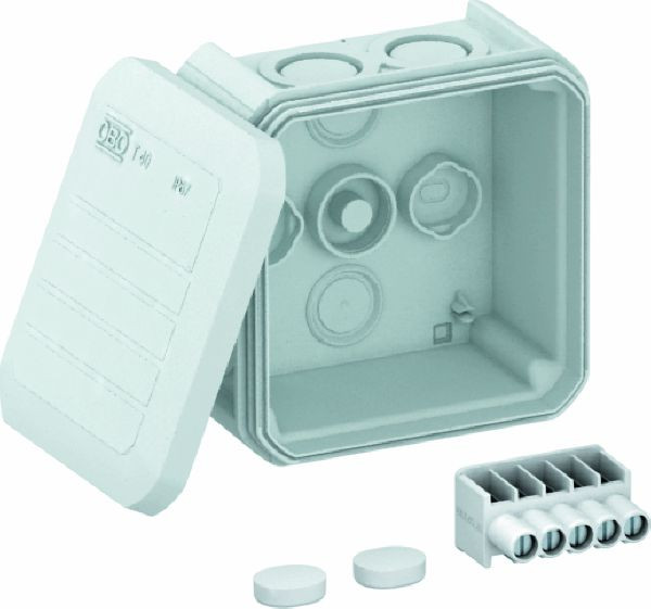 | Kurzbeschreibung | Kabelabzweigkasten Einführung M20 + Klemmleiste 90x90x52 Polypropylen lichtgrau RAL 7035 |