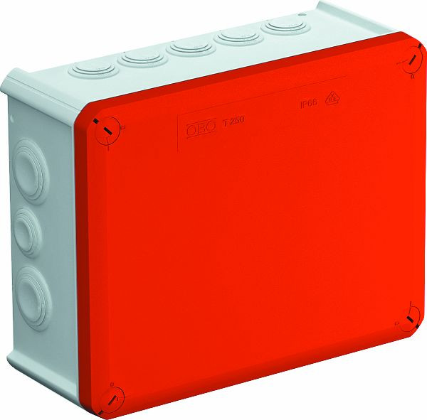 | Kurzbeschreibung | Kabelabzweigkasten mit Einführungen, rotem Deckel 240x190x95 Polypropylen, glasfaserverstärkt grau / rot |
