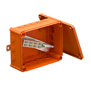 Kabelabzweigkasten mit keramischen Doppelklemmen und weichen Einsteckdichtungen. Ausreichender Verdrahtungsraum durch diagonal angeordnete Anschlusseinheit mit komplett vormontierten hochtemperaturbeständigen Keramikklemmen. Grün-gelb gekennzeichnete Schutzleiterklemme. Befestigung an gut zugänglichen Außenlaschen. Zugelassen für Kabelanlagen mit elektrischem Funktionserhalt nach DIN 4102 Teil 12 mit den Klassen E30, E60 und E90. Keramikklemmen wurden nach DIN EN 60998-2-1:2004 geprüft.