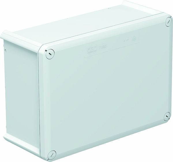 Kabelabzweigkasten geschlossen zum Verbinden von Kabeln und Leitungen im Innenbereich und geschützten Außenbereichen. Rechteckige Form ohne Einführungen. Geeignet für die Wand-/ Deckenmontage, die Montage auf Montageblechen und Gewinde im Boden. Mit der Möglichkeit zur Innenbefestigung und Montage über die Eckdome. Deckel mit Schnellverschluss, plombierbar. Hergestellt aus halogenfreien und UV-resistenten Materialien.
