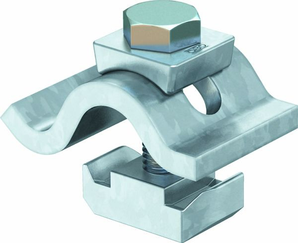 Spannklaue mit Gleitmutter für die Befestigung von Profilschienen an Stahlträgern.