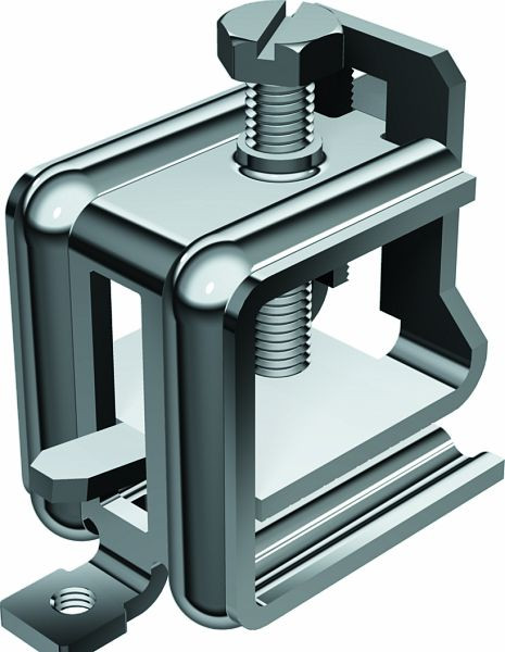Trägerschraubklammer zur Befestigung von Bauteilen an Stahlprofilen, mit M6-Gewindebohrung zur Aufnahme von Gewindestangen. Fixierung am Stahlträger oder Flacheisen mit Druckwanne und Sechskantschraube M8, Schlüsselweite 13 mm.