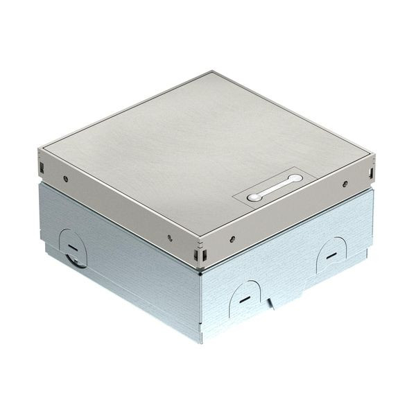 | Kurzbeschreibung | Bodensteckdose unbestückt, mit Bürstenauslass 140x140x75 Edelstahl, rostfrei A2 1.4301 blank, nachbehandelt |
