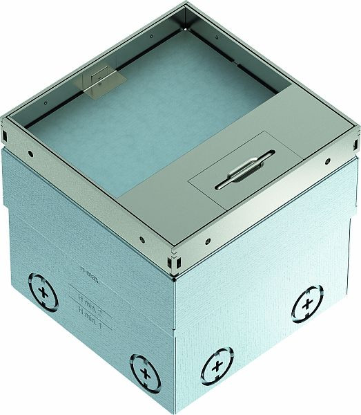 Quadratische Bodensteckdose für den Einsatz in trocken gepflegten Hohlböden und Estrichböden im Innenbereich. Einbaugehäuse mit vorgeprägten Einführungsöffnungen für Rohre (M20/M25). Oberteil durch 4 Nivellierstützen auf Oberkante Bodenbelag einstellbar. Die Mindesteinbautiefe beträgt 110 mm, der Nivellierbereich + 25 mm.