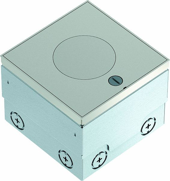 Quadratische Einbaueinheit für den Einsatz in trocken und nass gepflegten Hohlböden und Estrichböden. Einbaugehäuse mit vorgeprägten Einführungsöffnungen für Rohre (M25). Oberteil durch 4 Nivellierstützen auf Oberkante Bodenbelag einstellbar. Die Mindesteinbautiefe beträgt 110 mm, der Nivellierbereich + 25 mm.
