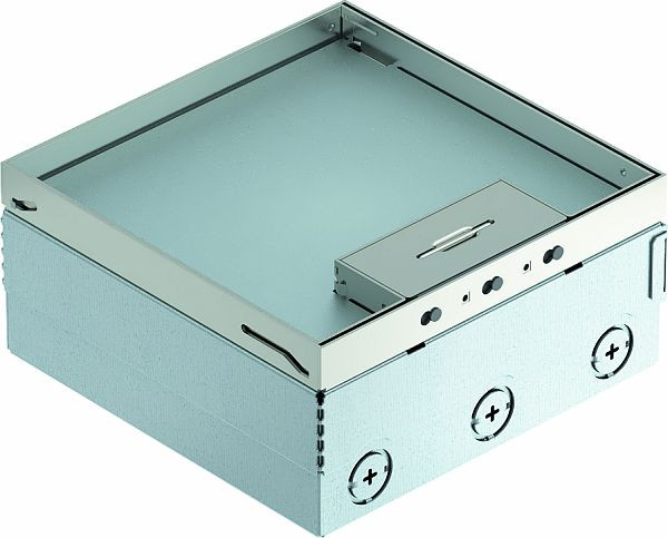 Quadratischer Bodentank für den Einsatz in trocken gepflegten Hohlböden und Estrichböden im Innenbereich. Einbaugehäuse mit vorgeprägten Einführungsöffnungen für Rohre (M25). Mit 2 Universalträgern UT3 45 3. Oberteil durch 4 Nivellierstützen auf Oberkante Bodenbelag einstellbar. Die Mindesteinbautiefe beträgt 95 mm, der Nivellierbereich + 30 mm.