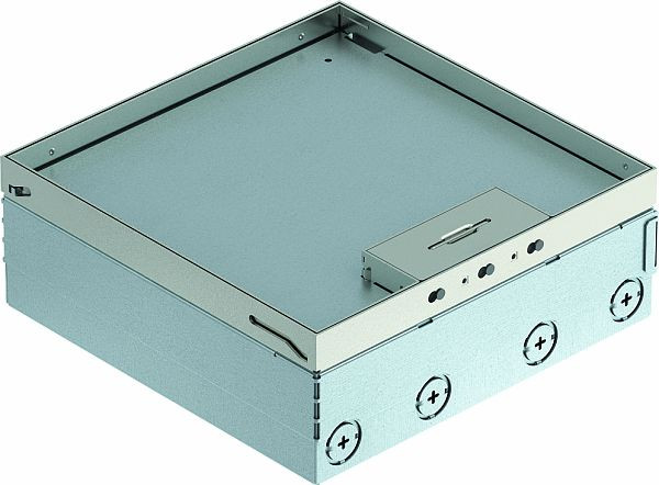 Quadratischer Bodentank für den Einsatz in trocken gepflegten Hohlböden und Estrichböden im Innenbereich. Einbaugehäuse mit vorgeprägten Einführungsöffnungen für Rohre (M25). Leergehäuse für bis zu 3 Universalträger UT4 für bis zu 12 Modul 45 ® -Einbaugeräte. Oberteil durch 4 Nivellierstützen auf Oberkante Bodenbelag einstellbar. Die Mindesteinbautiefe beträgt 95 mm, der Nivellierbereich + 30 mm.