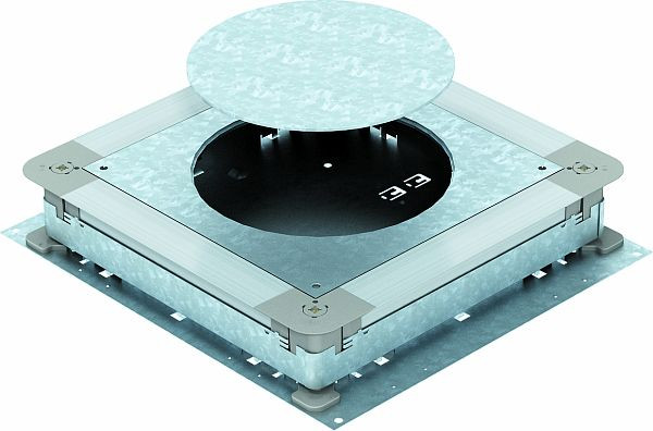 Unterflur-Gerätedose für estrichüberdeckte Unterflur-Installationskanäle mit Seitenwänden aus Stahlblech. Zur Montage von Einbaueinheiten der ausgewählten Nenngröße. Lässt sich stufenlos auf Estrichnennhöhe nivellieren (Schnellnivellierung möglich) und der Estrich kann bündig an die Estrichabzugskante angearbeitet werden. Mit schalltechnischer Entkopplungsmöglichkeit nach Estrichverlegung und mit Systemzubehör auch für Schwerlastanwendung verwendbar.