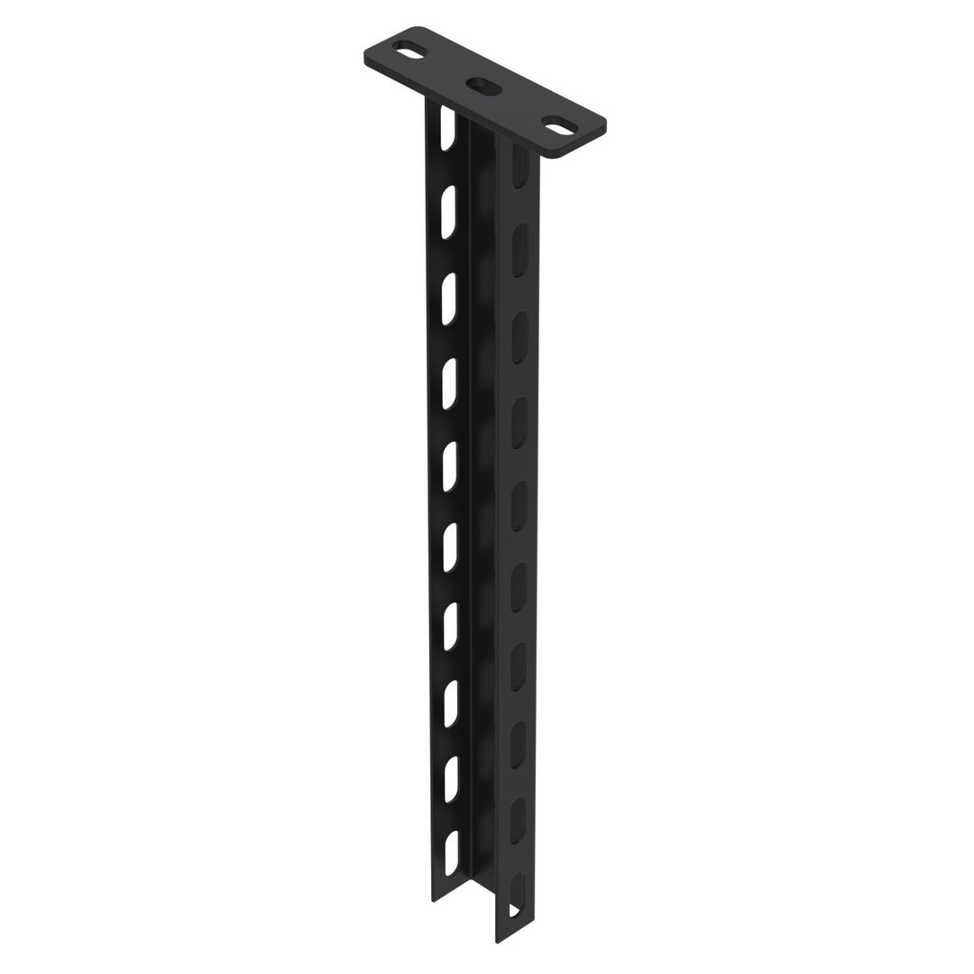 Hängestiel (U-Profil) in der Abmessung 50 x 30 mm mit angeschweißter Kopfplatte. Zur Befestigung an waagerechten Betondecken und Stahlträgern. Pulverbeschichtet in tiefschwarz (RAL 9005). Ab der Auslegerbreite 400mm oder der Montage des Auslegers am Ende des Hängestiels empfiehlt sich der Einsatz des Distanzstücks Typ DSK 25.