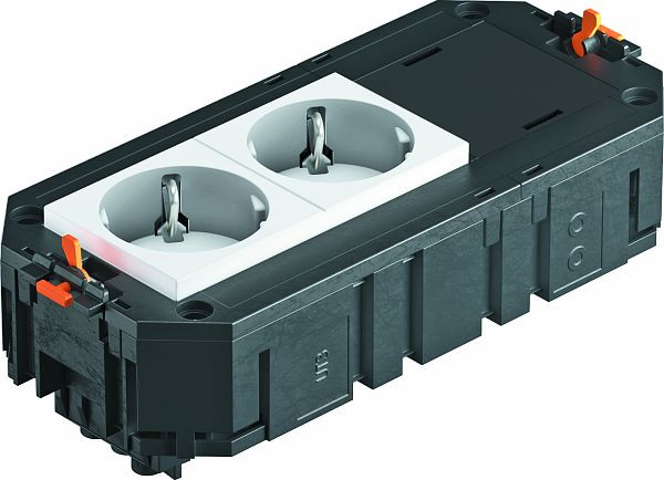 Der anschlussfertige Universalträger UTC3 verfügt über zwei vorinstallierte 33° Schutzkontakt-Steckdose und eine Blindabdeckung für den nachträglichen Einbau von einem Installationsgerät der Serie Modul 45 oder Modul 45connect. Passend zu den Verbindungsleitungen VL und den Geräteeinbaueinheiten der Nenngröße 2, 4, R4, 6 und R7.
