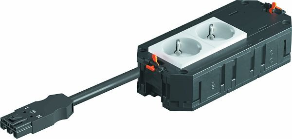 Der anschlussfertige Universalträger UTC3 verfügt über 2 vorinstallierte 33°-Schutzkontaktsteckdosen in weiß mit 16 A und eine Blindabdeckung für den nachträglichen Einbau von einem Installationsgerät der Modul45- oder Modul 45connect-Serie. Passend zu den Verbindungsleitungen VL und den Geräteeinbaueinheiten der Nenngröße 2, 4, R4, 6 und R7.